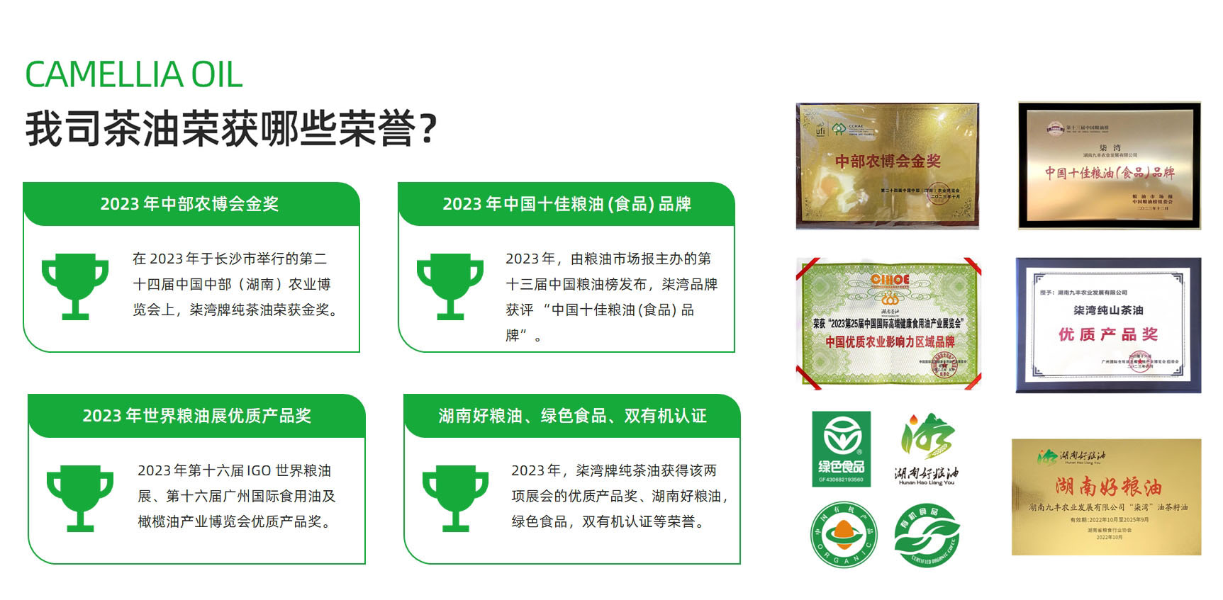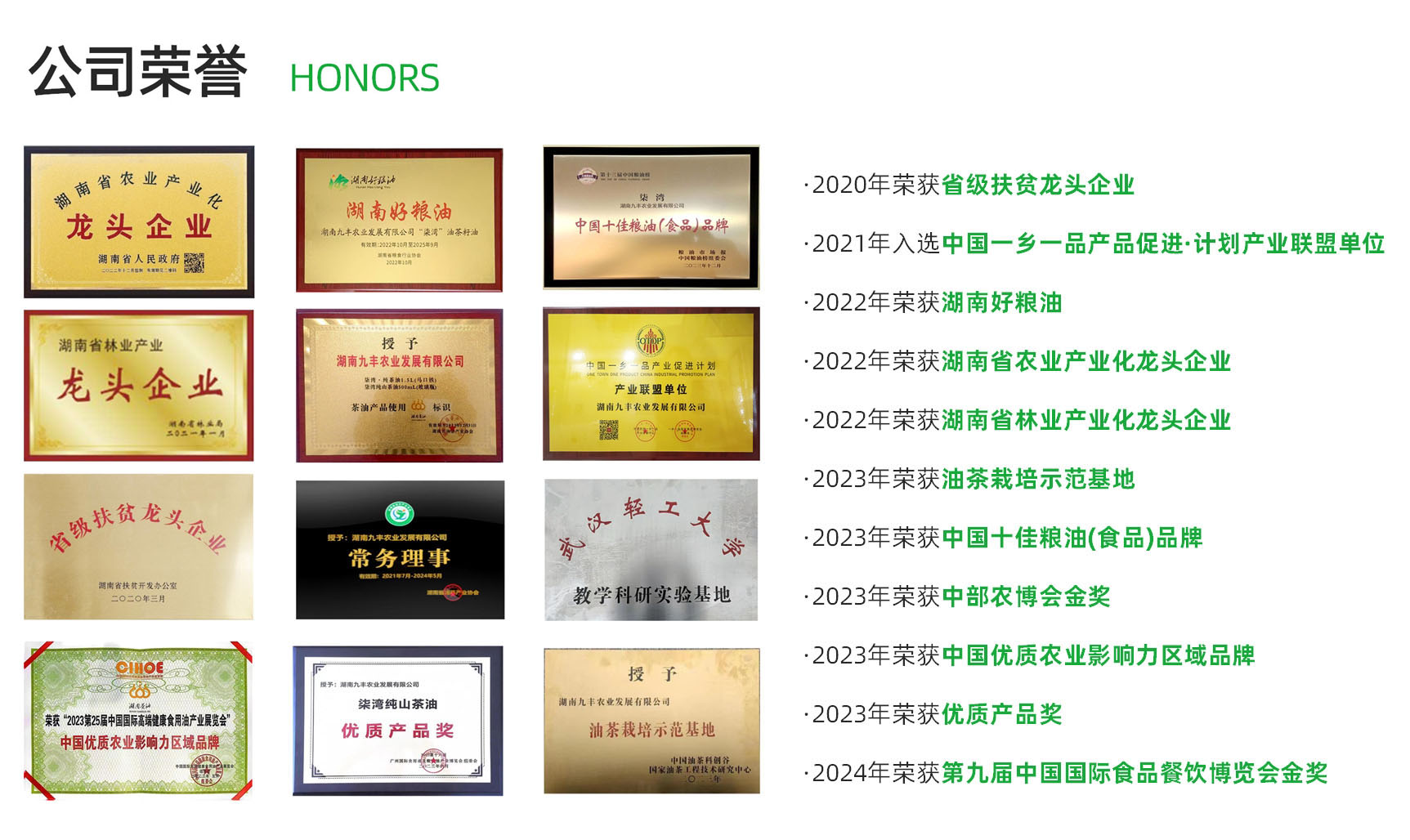 公司先后荣获得“湖南省农业产业化龙头企业”、“湖南省扶贫龙头企业”、“诚实守信企业”、“国家农民合作社示范社”、“岳阳市农业产业化龙头企业”等称号,纯茶油等系列产品被认证为“有机”、“绿色”食品。